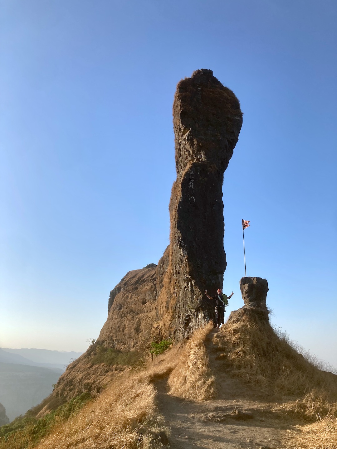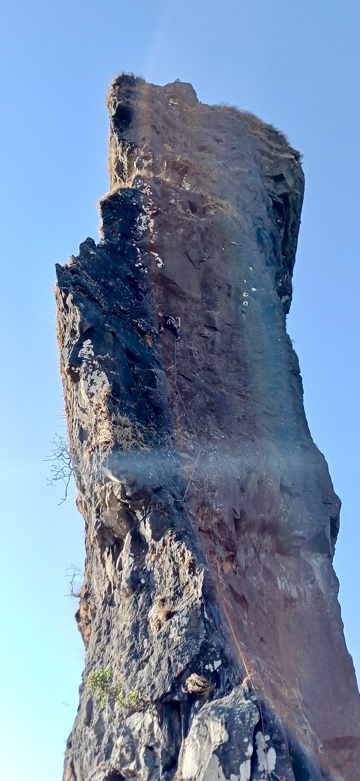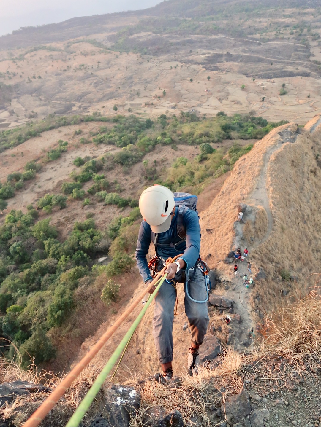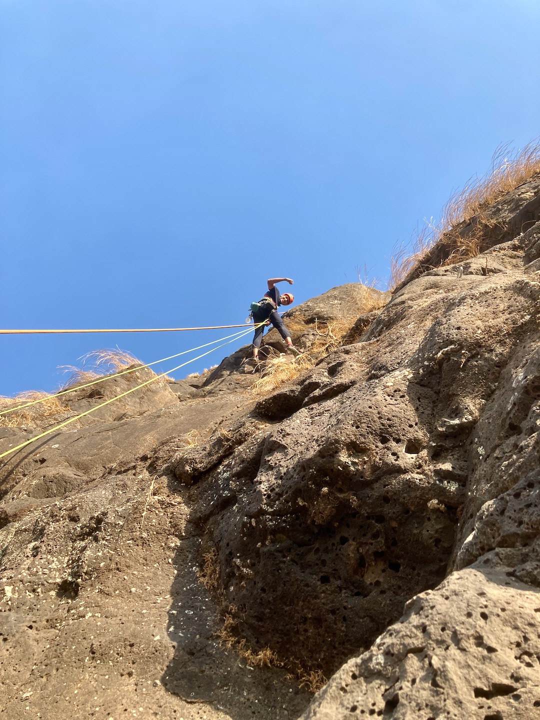 i’ve been practising sport-climbing at crags around bombay (in belapur and dighe) this winter. after several months of feeling unconfident, i finally said yes when invited to climb a pinnacle. we ascended telbaila via the village route1: ramkumar led the climb2; niraj was in the middle; i was the last-man, climbing with our water and food.