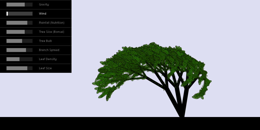 a tree is affected by different variables: by external factors like wind, rainfall and gravity, and also by innate qualities like stockiness and leaf size.