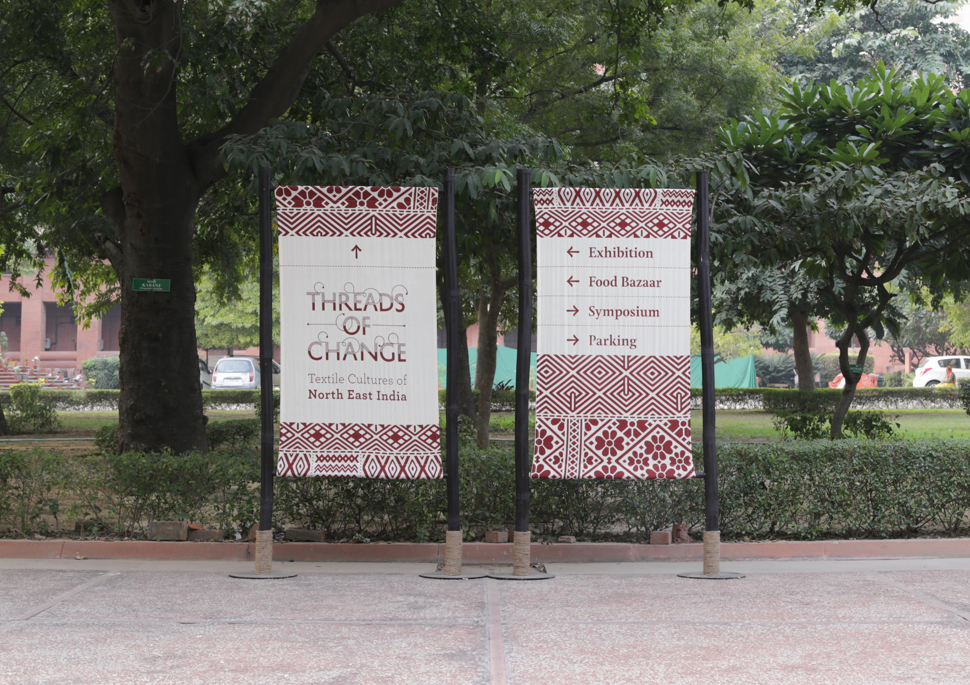 standees for signage: screen printed on muslin cloth which was held taut on a bamboo frame. bamboo is abundantly used in north-east india, and was employed on several structures in the exhibition.