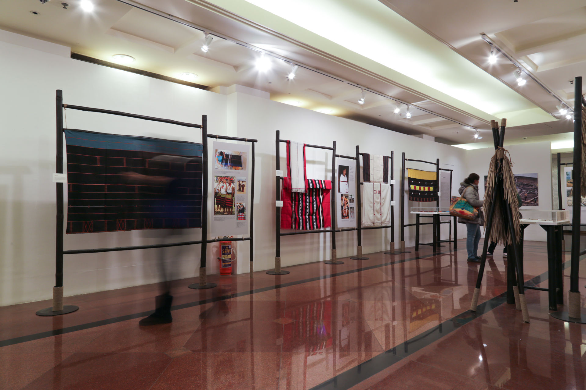 exhibits were suspended from the ceiling, or held within bamboo frames, or placed on tables. exhibits and information panels were held fast to their frames with jute rope. structures were built for disassembly and transport, so that the exhibition could travel to different locations in the country.