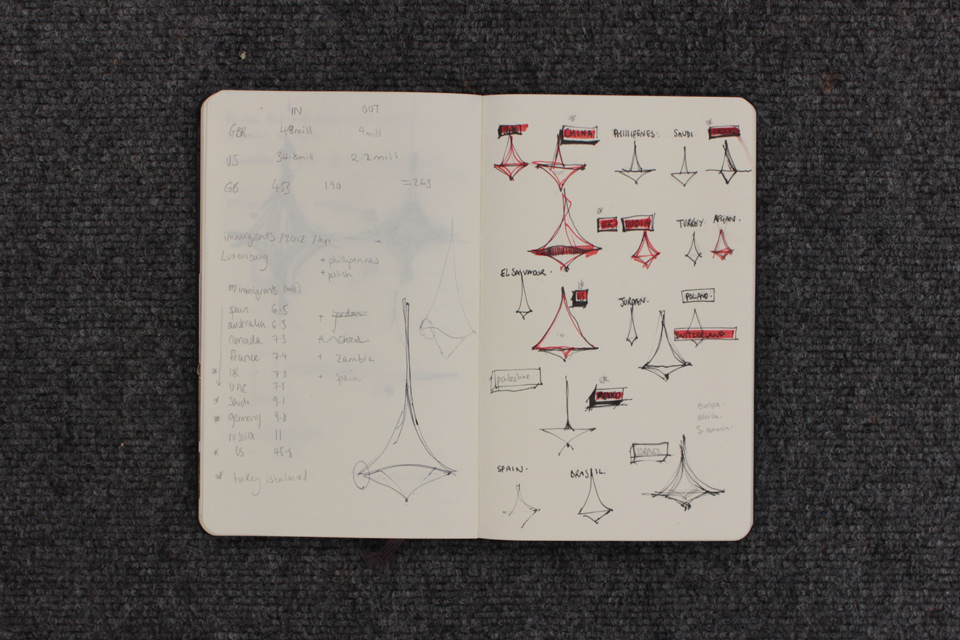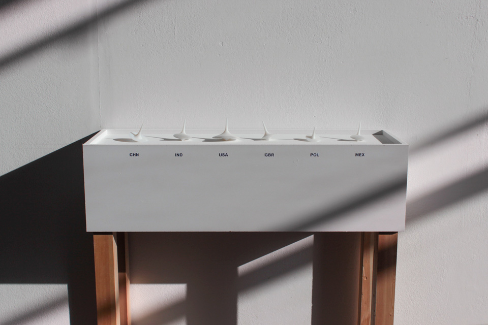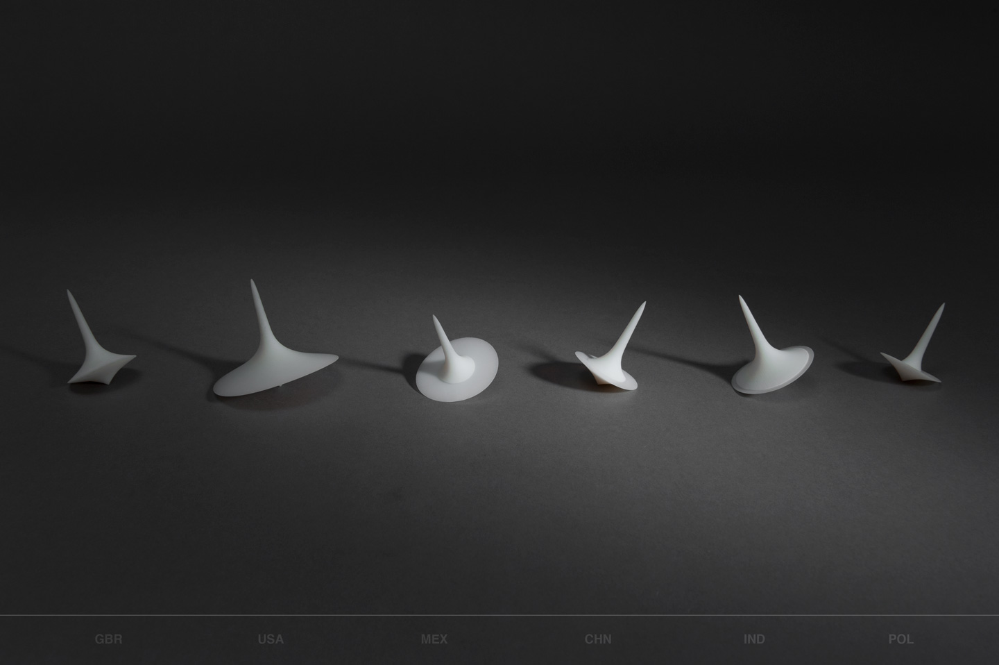 data manifestation: 3D-printed tops to present migration data. a top represents the number of immigrants (upper half) and emigrants (lower half) for each country.