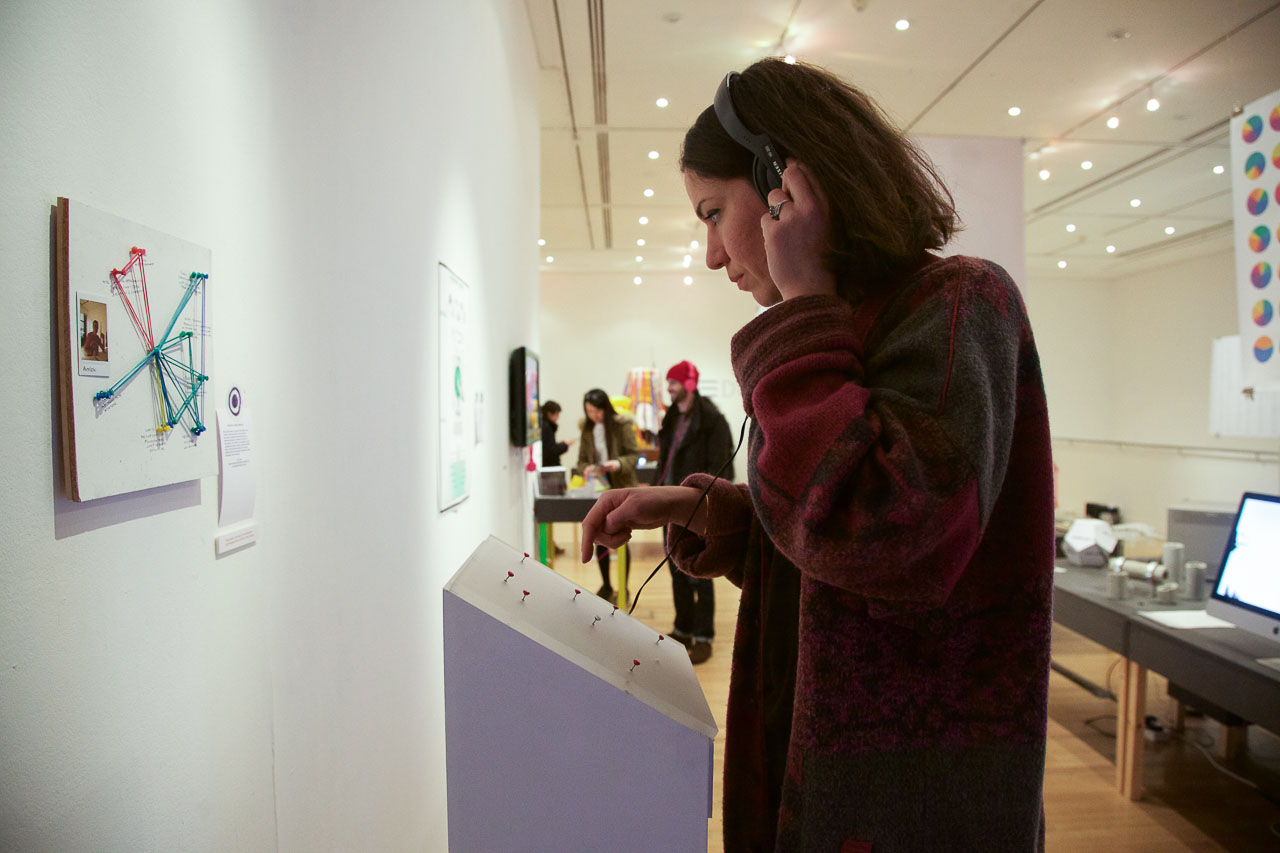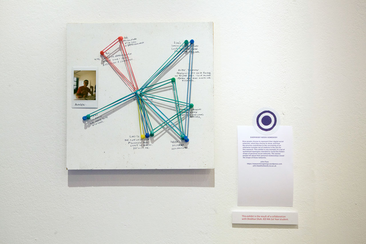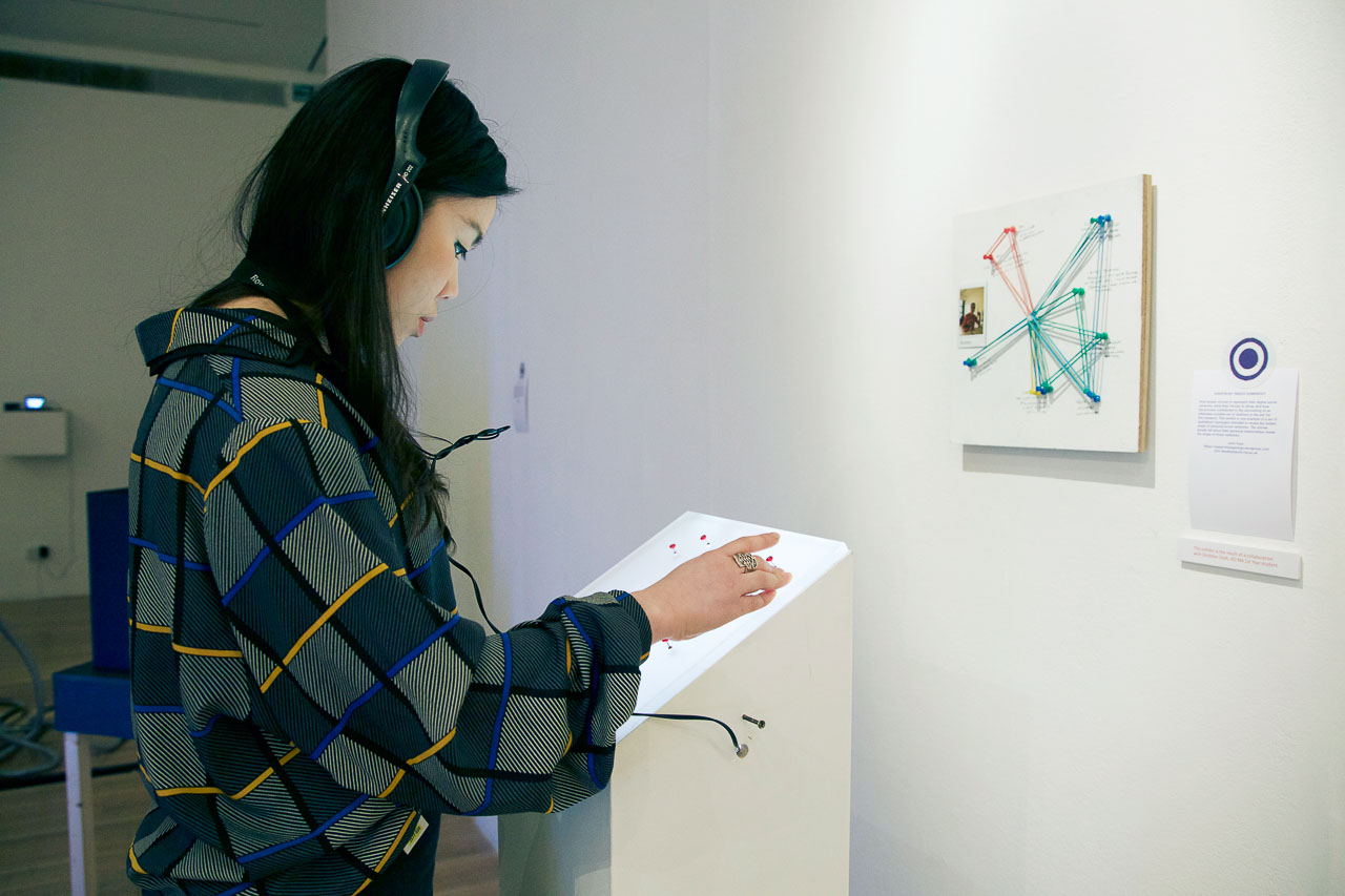 in john’s study, people used elastic bands and pins to build physical ‘models’ of their social networks. i helped john build an interactive representation of one such model — push-buttons on a back-projected screen, to let visitors select and watch videos of a participant’s social network.