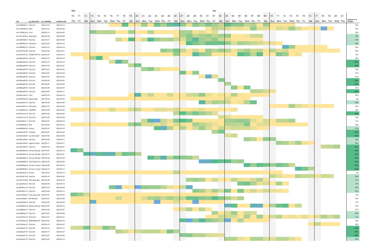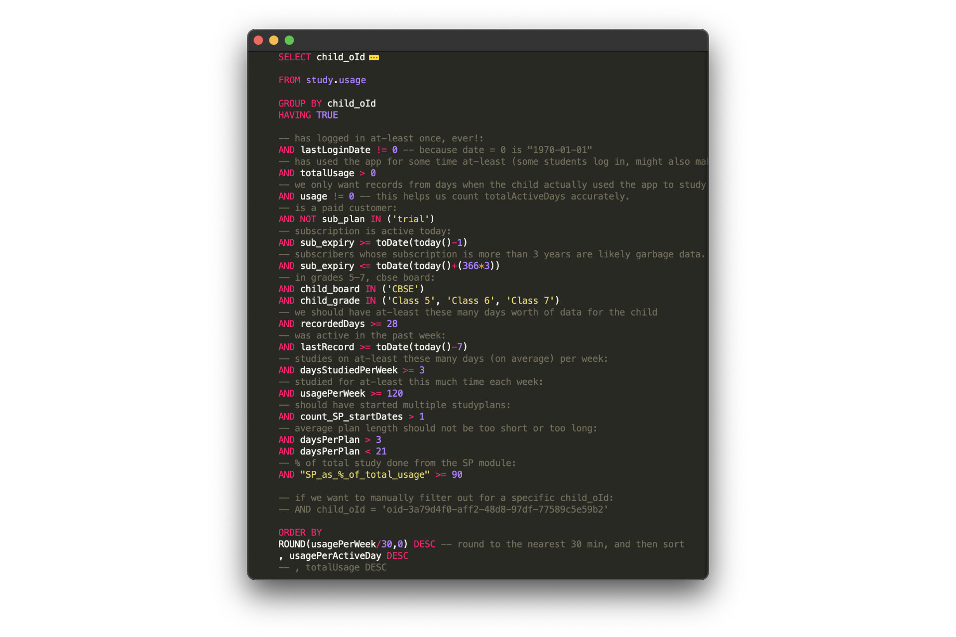 i wrote this query to help us find different kinds (‘cohorts’) of students. we could then study their behaviour, test hypotheses, or even reach out to them for specific feedback. we discovered trends in planning behaviour and study frequency, and brought those insights into feature-designs.
