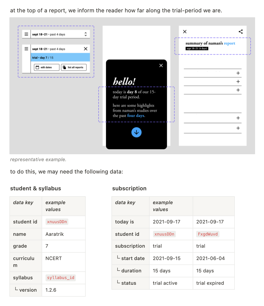over time: we crafted a conversational interface (without voice or chat) ; designed reports that eschew charts, graphs or comparisons1 ; invented a highlight/select tool ; and helped encode the design-team’s principles (for a better study app) into the product.
