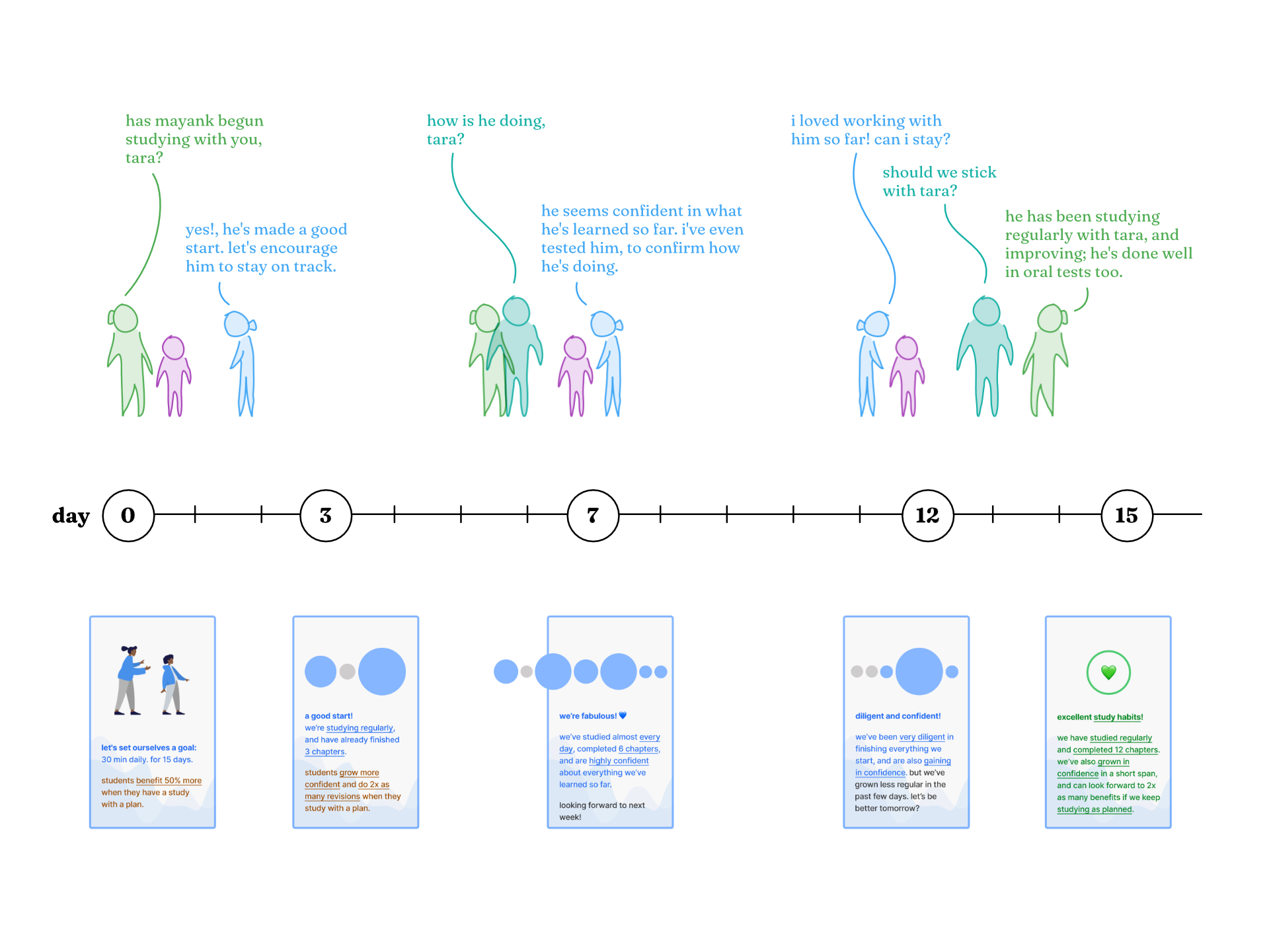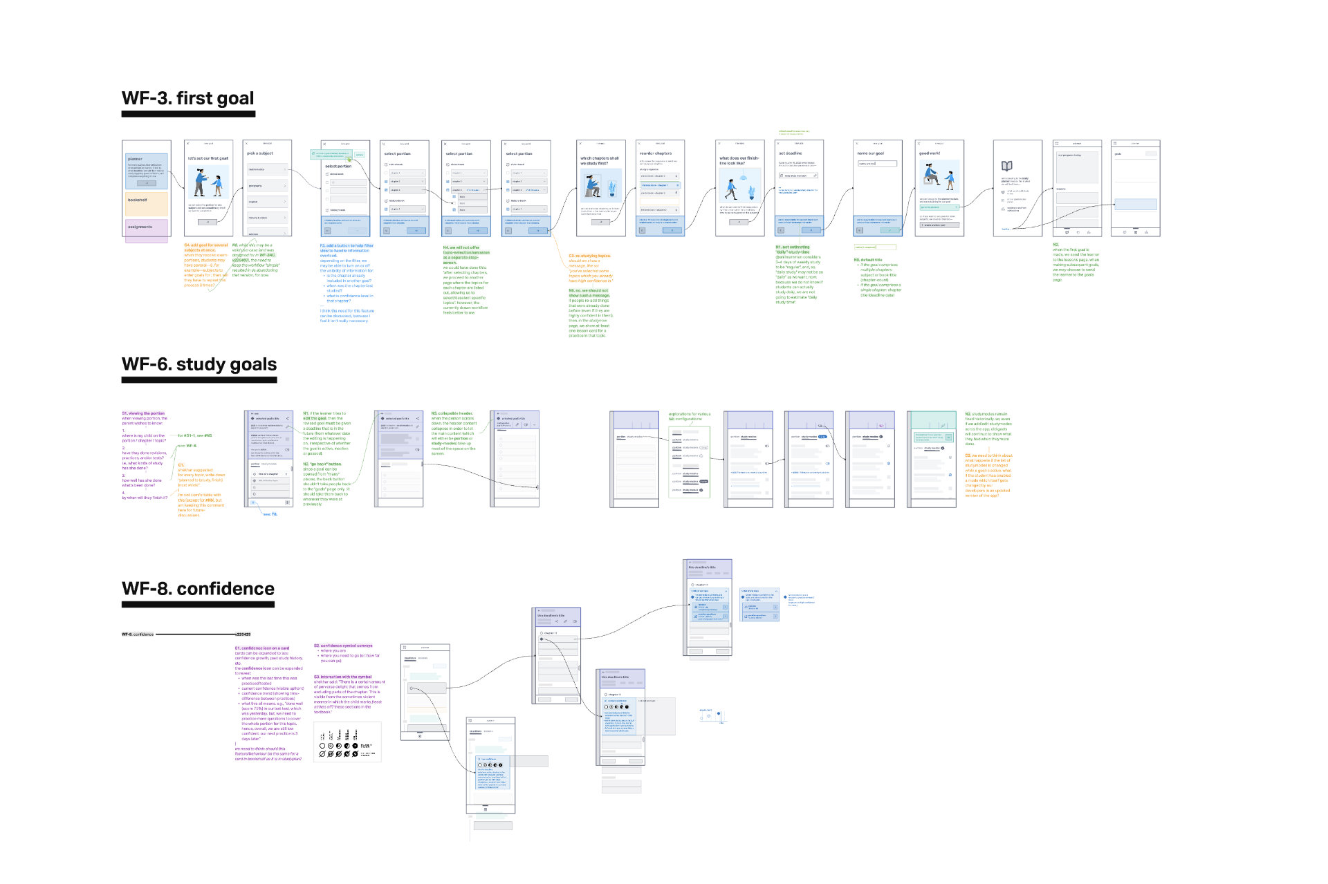 by sketching conversations between these people, we built experience flows of how they’d feel at various points in the year (eg. before a test, at the start of a subscription, at the end of a week, etc).