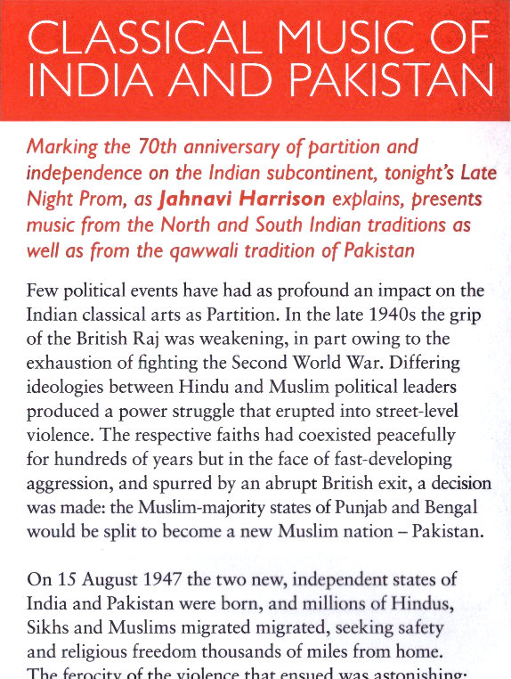 the description to a musical event talked about the partition, which i thought was irrelevant (because western classical performances at the venue weren’t littered with references to the violent pasts of medieval european kingdoms). further disappointing was the way the text described the partition and the independence: with only a token reference to (centuries worth of) british contribution to communal violence.