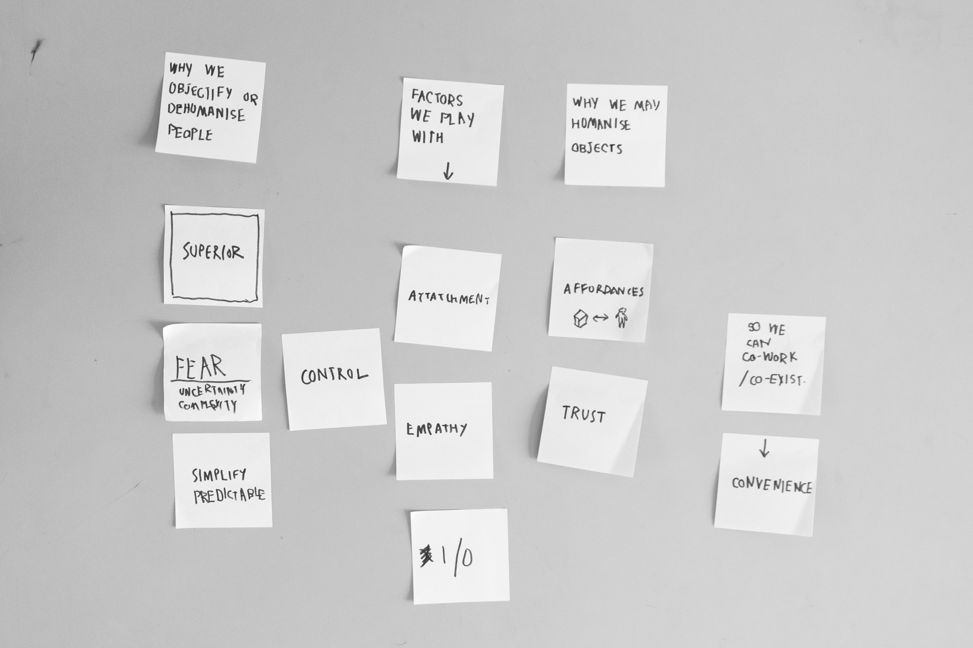 an essay on little thoughts of thinking machines (1983); the first-half of a podcast on objectification and humanisation (2016); a video inciting anthropomorphisation (1944); a paper on theory-formation in design; group discussions; open crits.