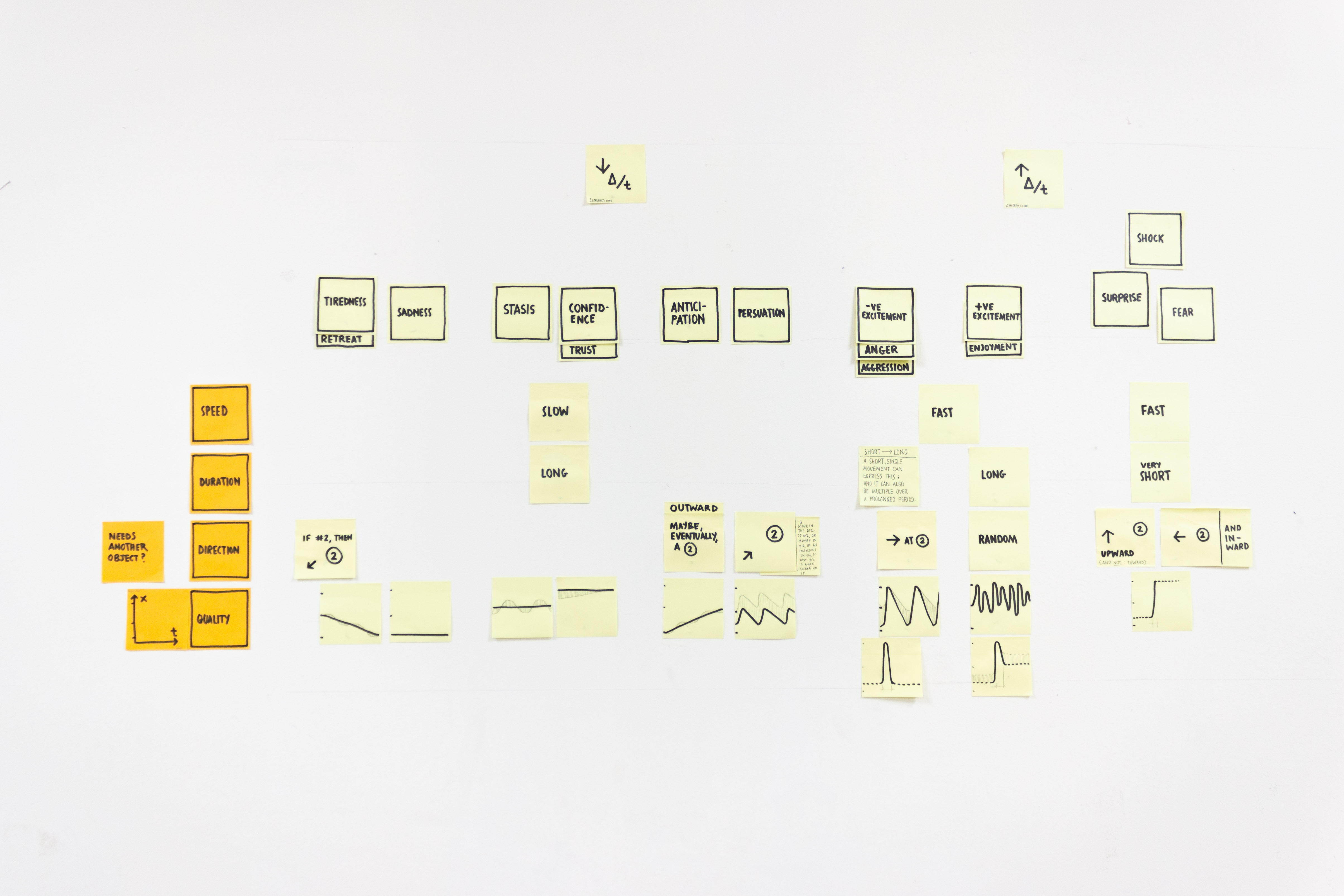 we identified that words like ‘anger’, ‘disgust’ or ‘sadness’ may not be suitable for describing machine expressions; instead, we could describe the state and behaviour of machines in terms of their energies: low, high, intensely transmitted, conserved, directed or not, etc.