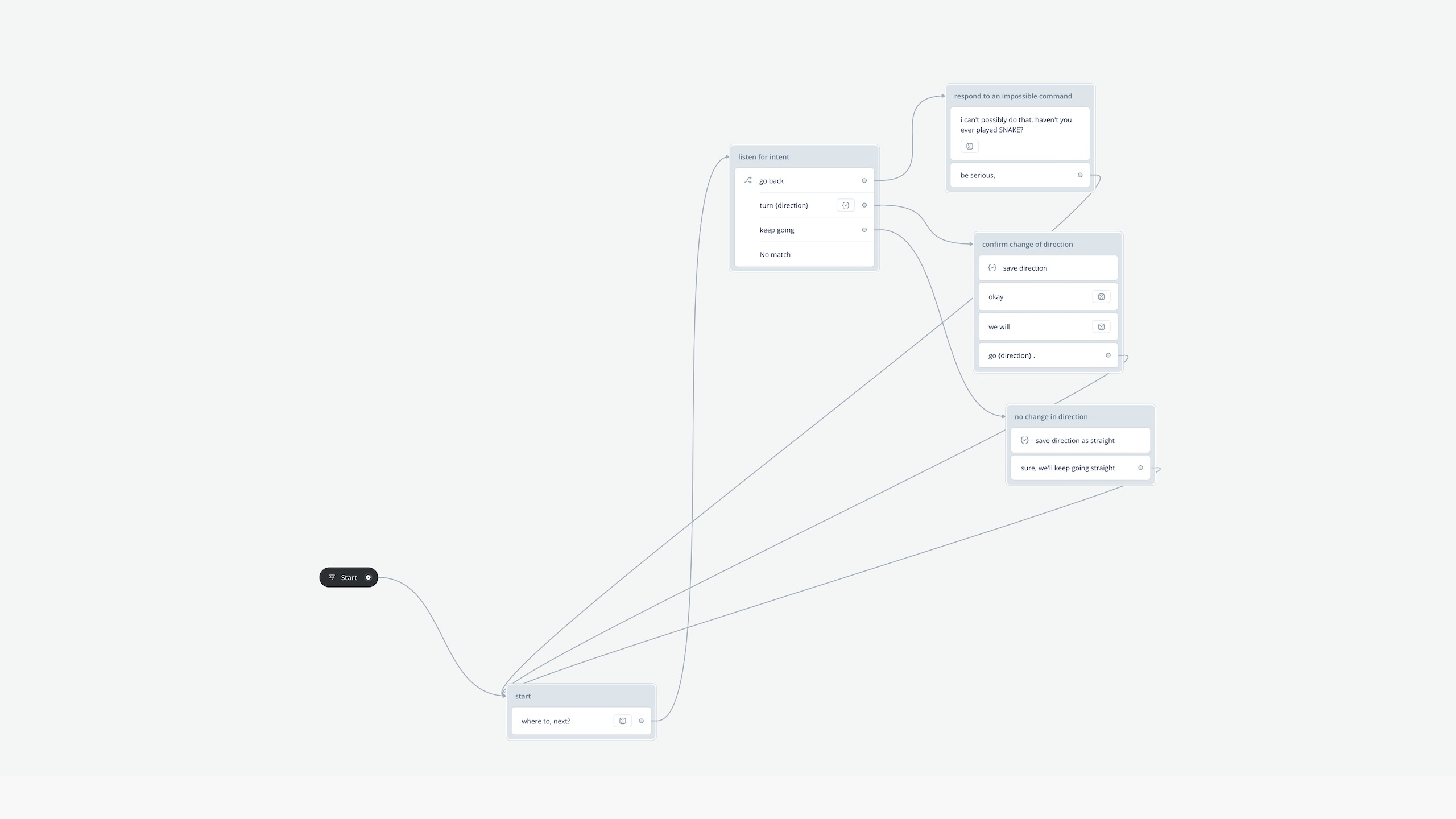 my example to the class at the end of the day, showing how entities allow you to define ‘listen for “go {direction}”’ and respond with “okay, i’m going {direction}”. i also introduced them to variables and utterance-variants through this example.