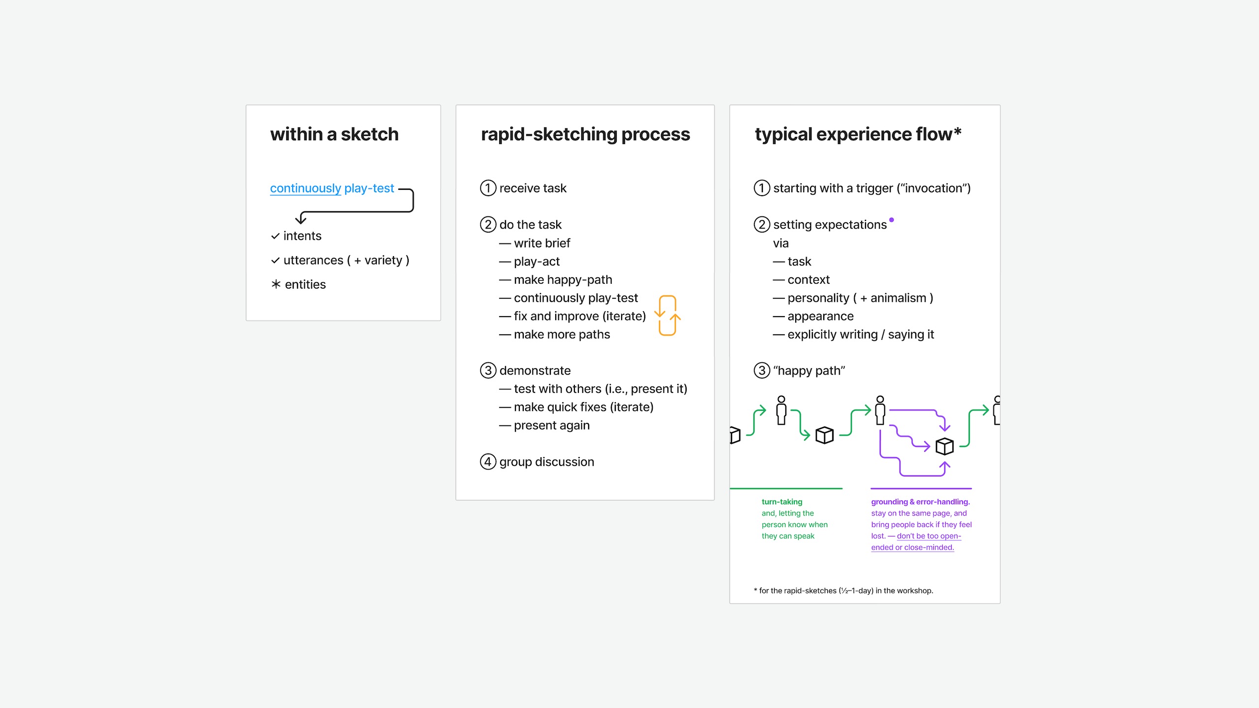 while prototyping, testing and iterating, we discussed several things: the importance of affordance in context; setting and managing expectations; tapering; equipping a person to issue the right commands; giving relevant feedback (to let a person know what state the machine is in); and even some basic error handling, to enable the interaction to recover from an error elegantly.