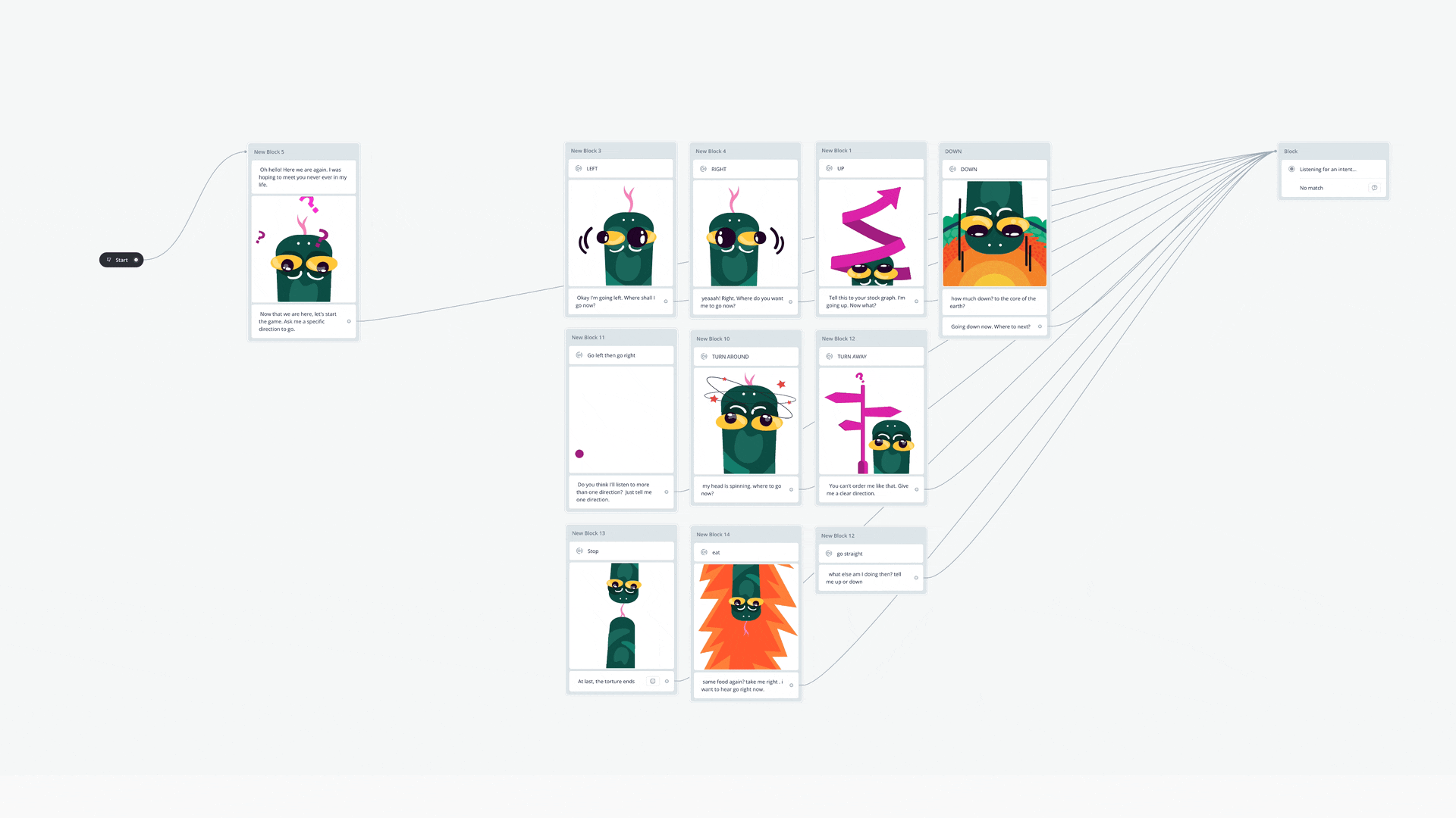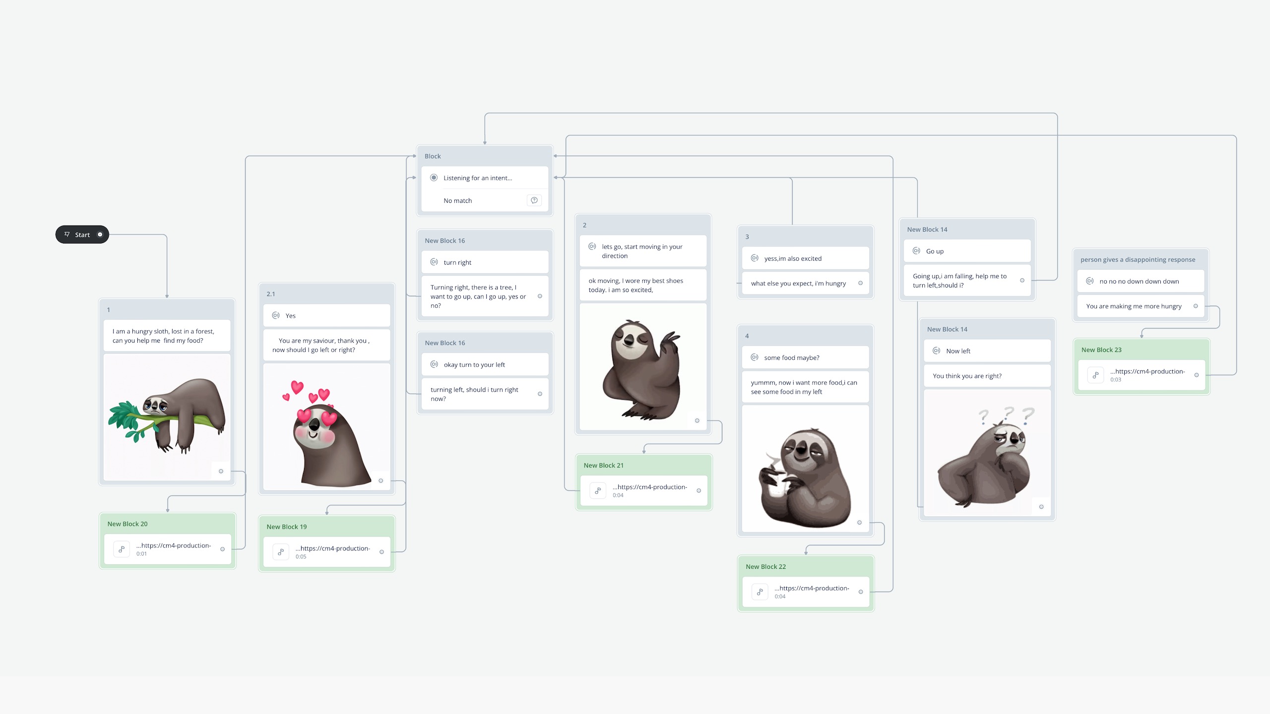 a sloth persona, with sounds played at the end of each machine-turn. (nb. green blocks.)