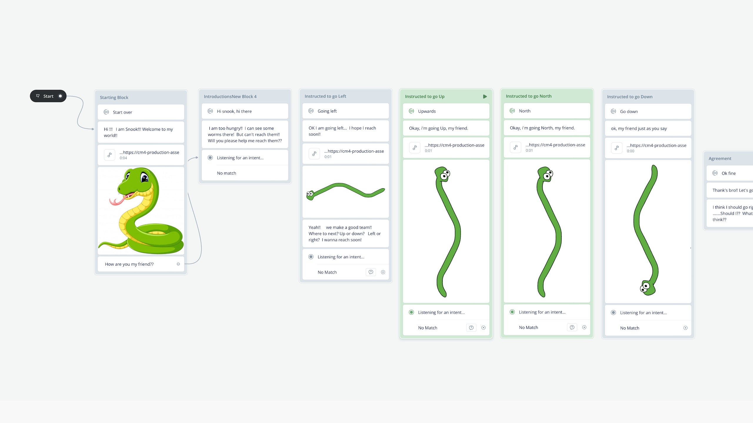in this project, students worked in groups and made an interaction lasting several turns. since the intents for a snake game were easy (”turn left”, “go right”, “keep going straight”, “go up”, etc), this project focused on multi-modality (specifically: offering visual feedback besides voice/text), and opened-up discussions about personas. students were encouraged to imagine what kind of a person(ality) their game’s “snake” was, and let that be reflected in how the snake responded to intents.